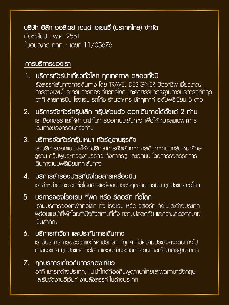 เพราะเรา…ดูแลทุกการเดินทางของท่าน ด้วยระดับพรีเมียม 5 ดาวแท้ ทั้งการคัดสรร เส้นทาง โรงแรม ยานพาหนะ และร้านอาหาร อย่างมืออาชีพ พร้อมใส่ใจในทุกขั้นตอนของการบริการ