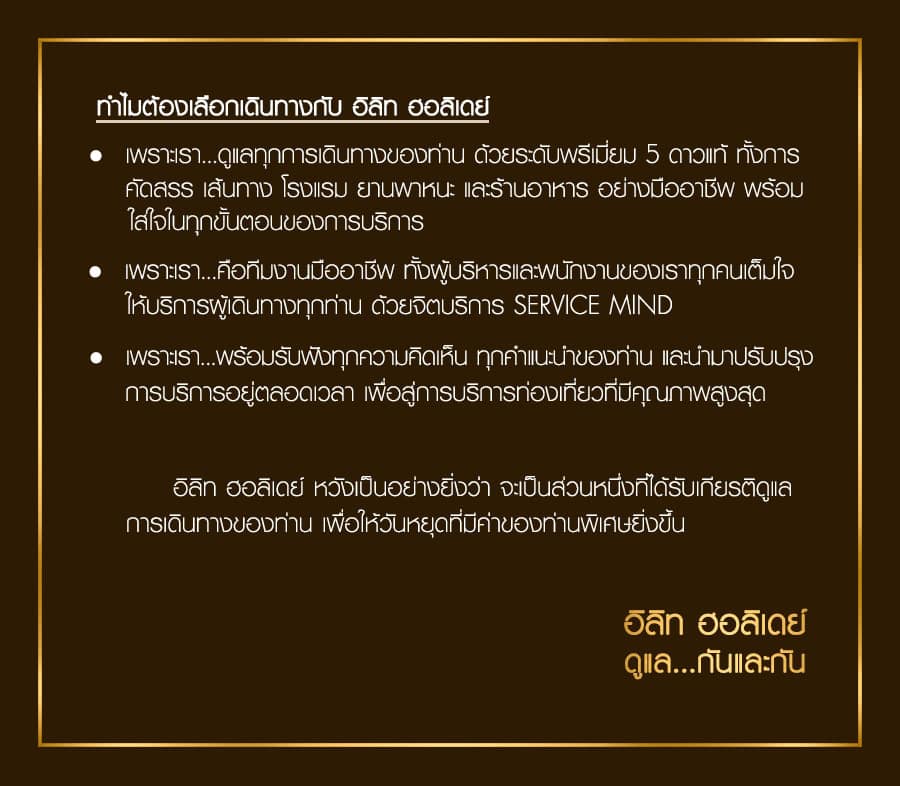 อิลิท ฮอลิเดย์ หวังเป็นอย่างยิ่งว่า จะเป็นส่วนหนึ่งที่ได้รับเกียรติดูแลการเดินทางของท่าน เพื่อให้วันหยุดที่มีค่าของท่านพิเศษยิ่งขึ้น