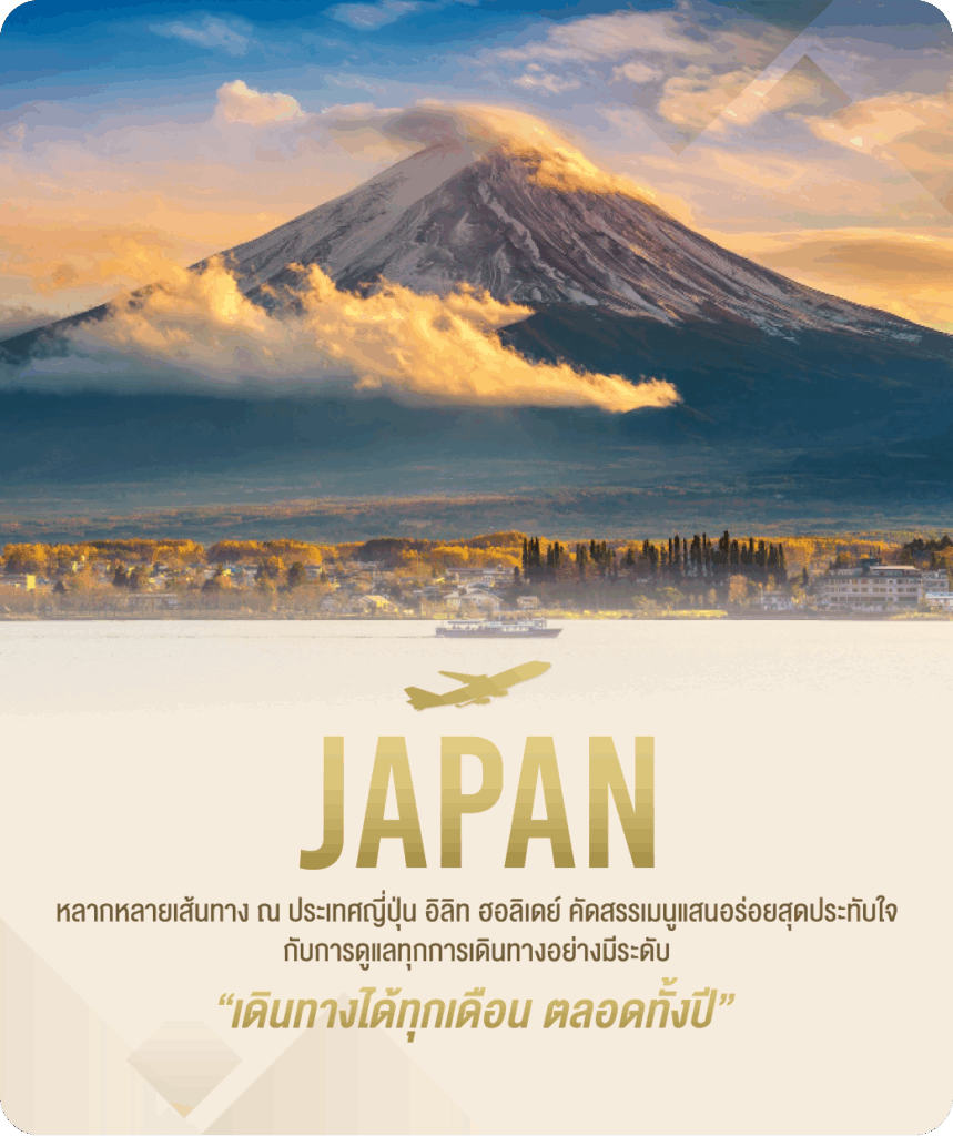 เที่ยวญี่ปุ่นทุกช่วงเทศกาล ไม่ว่าจะเป็นแบบทัวร์ส่วนตัวกลุ่มเล็ก หรือกรุ๊ปทัวร์กลุ่มใหญ่ ด้วยบริการทัวร์ญี่ปุ่น 5 ดาว ทัวร์ญี่ปุ่นปีใหม่ ทัวร์ญี่ปุ่นส่วนตัวและแบบกลุ่มระดับพรีเมี่ยม ในรูปแบบทัวร์ญี่ปุ่นราคาสุดคุ้มจากอิลิท ฮอลิเดย์ ดูแล…กันและกันตลอดทริป ให้คุณดื่มด่ำบรรยากาศธรรมชาติ รับประทานอาหารเลิศรส พักในโรงแรมสุดหรู เที่ยวสบายตลอดทริปญี่ปุ่น ทัวร์กับเรา ไม่มีผิดหวัง