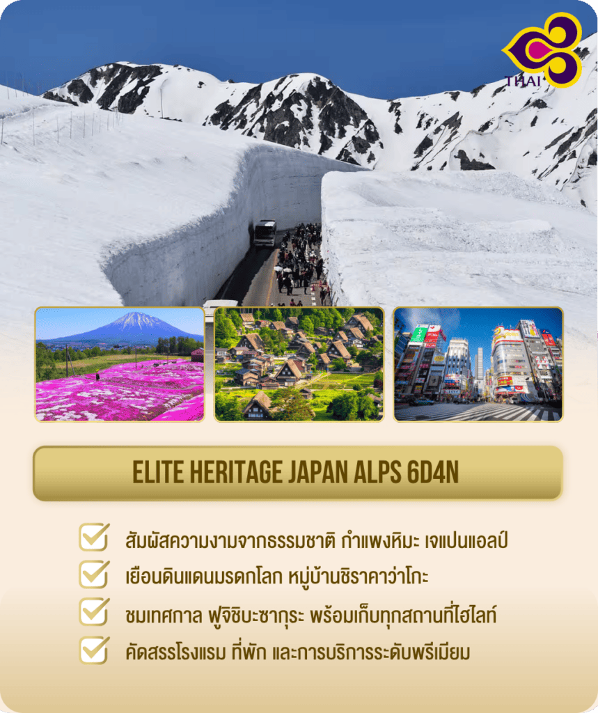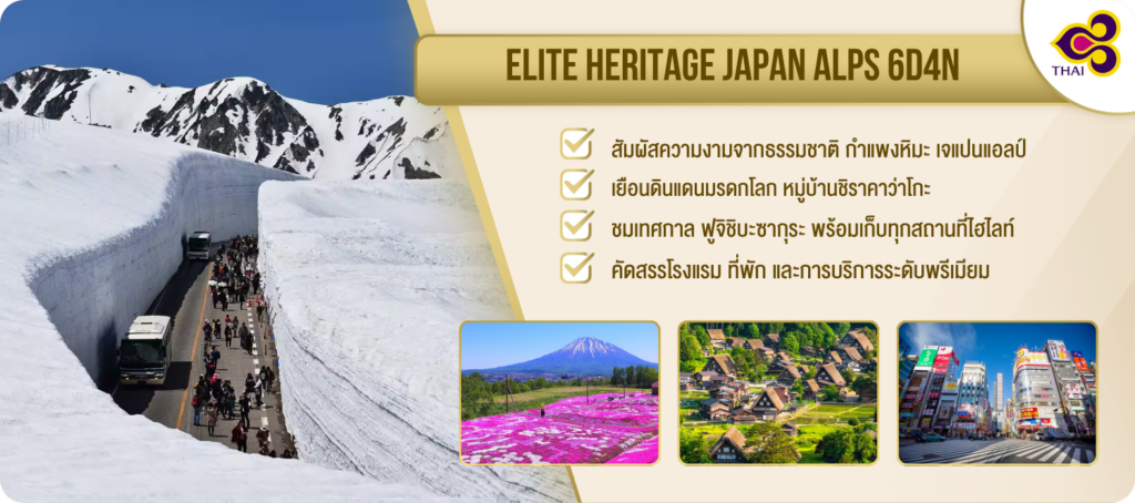 อิลิท ฮอลิเดย์ เยือนญี่ปุ่นด้วยความประทับใจกับสถานที่ที่เปี่ยมด้วยมนต์เสน่ห์เฉพาะตัว ทั้งธรรมชาติและวัฒนธรรม ชมความงามที่รังสรรค์จากธรรมชาติ กำแพงหิมะ เจแปนแอลป์ – หมู่บ้านมรดกโลก ชิราคาว่าโกะ เสิร์ฟความอร่อยด้วยอาหารท้องถิ่นหลากเมนู และรสชาติอันเป็นเอกลักษณ์ คัดสรรที่พักพร้อมบริการ แสนพิเศษเฉพาะคุณ ร่วม “ดูแล…กันและกัน”