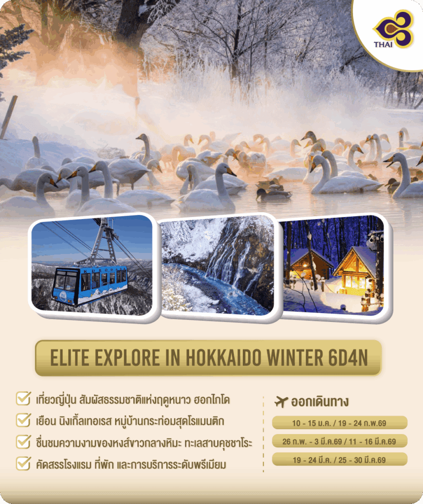 อิลิท ฮอลิเดย์ นำท่านสู่ดินแดนปลาดิบ ณ ประเทศญี่ปุ่น สัมผัสธรรมชาติแห่งฤดูหนาว ฮอกไกโด เยือน นิงเกิ้ลเทอเรส หมู่บ้านกระท่อมสุดโรแมนติก ชื่นชมความงามของหงส์ขาวกลางหิมะ ทะเลสาบคุชชาโระ และสถานที่ไฮไลท์สุด Unseen เดินทางโดยสายการบินไทย พร้อมที่พักและการบริการสุดประทับใจ ดูแล… กันและกัน