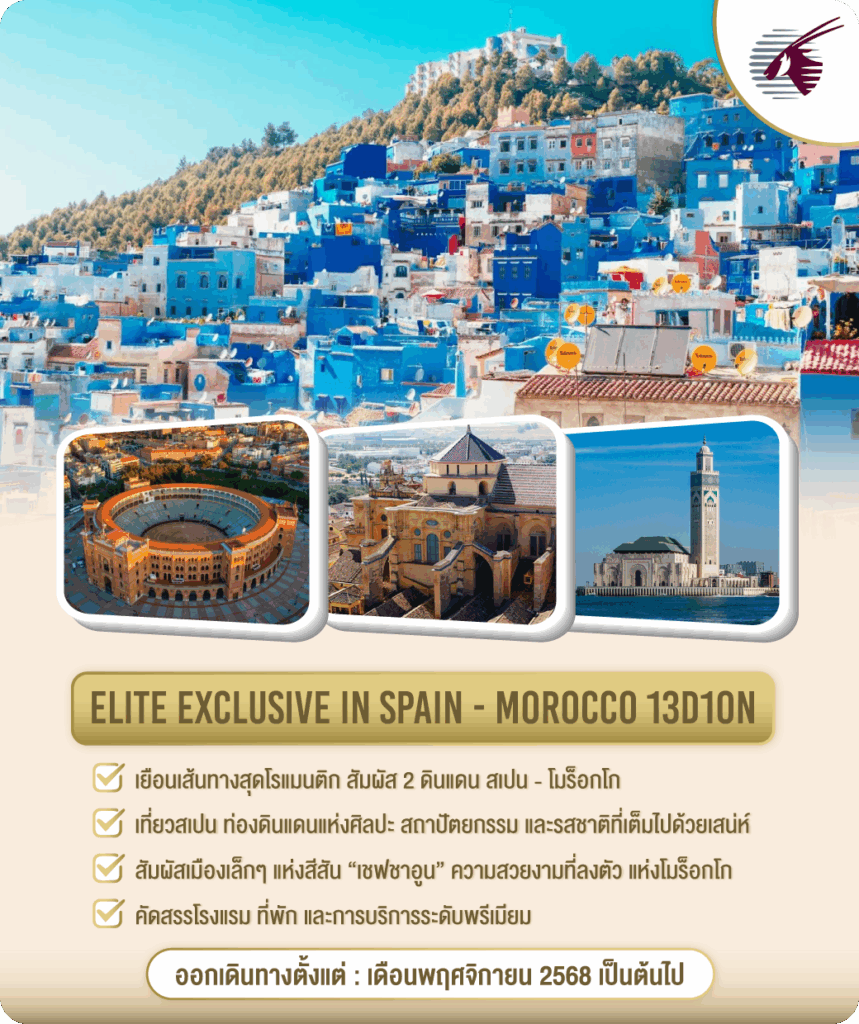 อิลิท ฮอลิเดย์ นำท่าน สัมผัส 2 ดินแดน สเปน – โมร็อกโก เที่ยวสเปน ท่องดินแดนแห่งศิลปะ สถาปัตยกรรม และรสชาติที่เต็มไปด้วยเสน่ห์ สัมผัสเมืองเล็กๆ แห่งสีสัน “เชฟชาอูน” ความสวยงามที่ลงตัว แห่งโมร็อกโก และเก็บครบทุกสถานที่ไฮไลท์สำคัญ พร้อมที่พัก การบริการในระดับพรีเมียม ดูแล…กันและกัน
