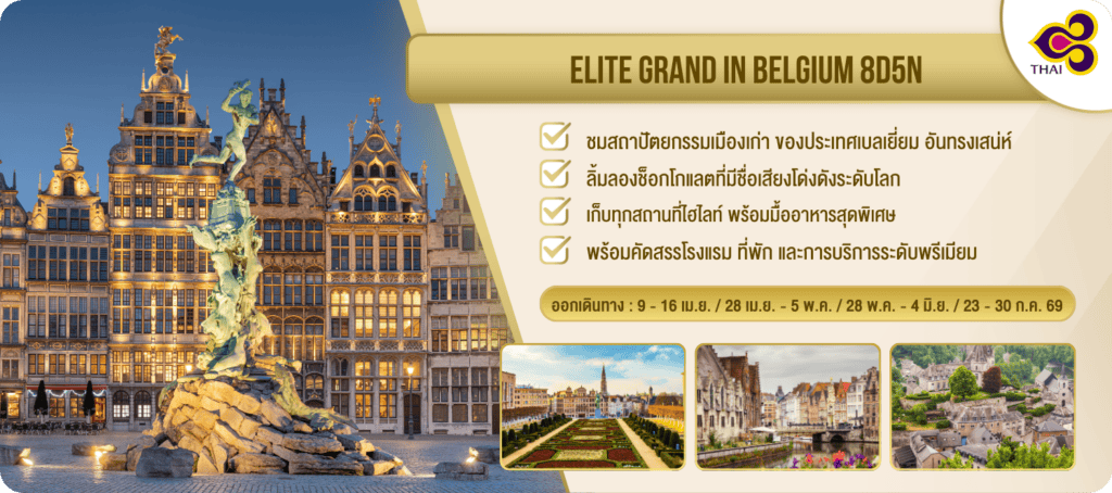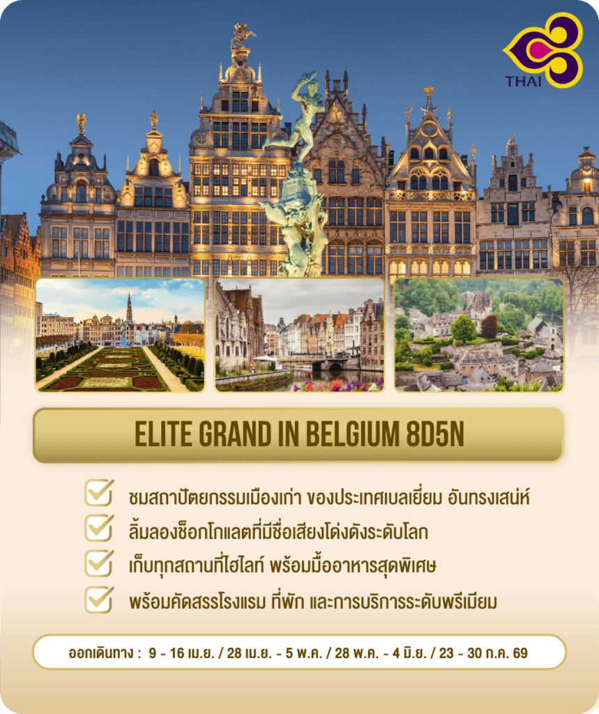 อิลิท ฮอลิเดย์ นำท่านสัมผัสเส้นทางสุดประทับใจ ชมสถาปัตยกรรมเมืองเก่า ของประเทศเบลเยี่ยม ประเทศเล็ก ๆ อันทรงเสน่ห์ เยือนเมืองบรัสเซลล์ เมืองเกนต์ เมืองแอนต์เวิร์ป และเมืองดูร์คบุย พร้อมลิ้มลองช็อกโกแลตที่มีชื่อเสียงโด่งดังระดับโลก เดินทางโดยสายการบินไทย พร้อมที่พัก และการบริการในระดับพรีเมียม