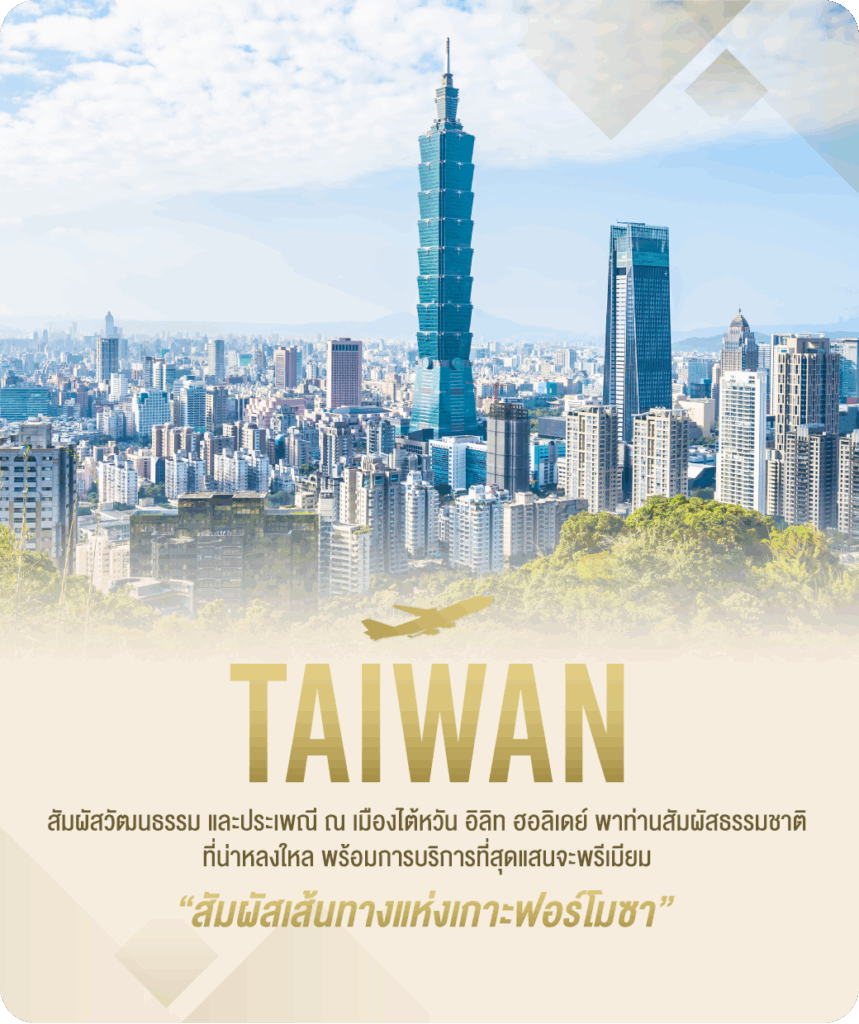 ทัวร์ไต้หวัน สัมผัสความทันสมัยที่ผสานวัฒนธรรมดั้งเดิมจากแผ่นดินใหญ่ ได้อย่างลงตัว ศูนย์กลางที่เศรษฐกิจที่สำคัญอีกแห่งหนึ่งของเอเชีย ธรรมชาติที่มีหลากหลายภูมิทัศน์ สมบัติทางประวัติศาสตร์ที่ประเมินค่ามิได้ ทำให้ประเทศเล็กๆ นี้มีเสน่ห์ และน่าเยือนเป็นที่สุด ยกระดับการเดินทางให้พิเศษเหนือใคร ด้วยการบริการในะดับพรีเมียม